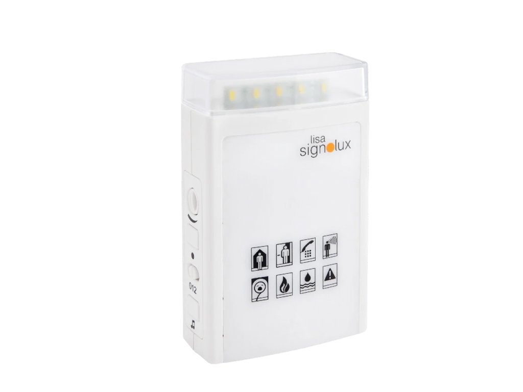 Lisa-signolux Receiver-S rozšiřuje systém o další přijímač, který informuje o dění v domácnosti záblesky světla v rozsahu 360°, barevnými symboly událostí a podle potřeby také zvukem – díky velké světelné kopuli v horní části přístroje.