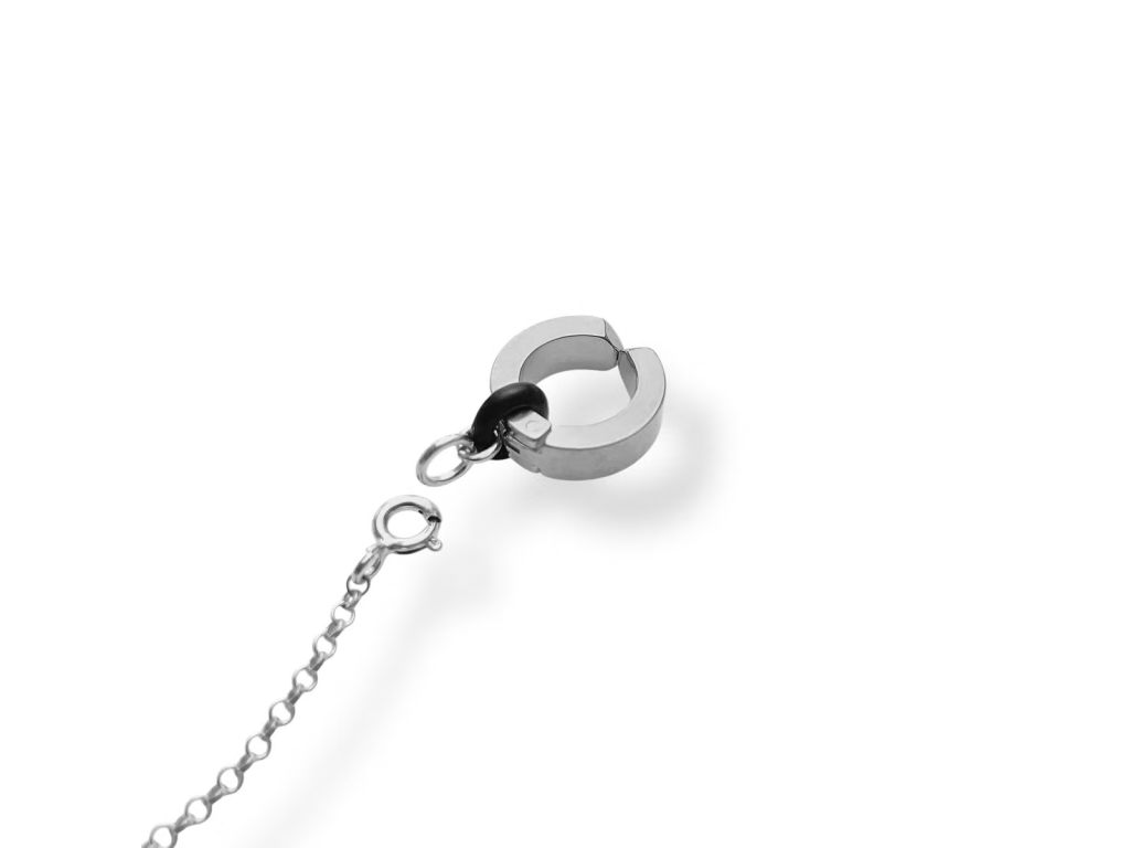 K naslouchátku se připevňuje pomocí jiného Deafmetalového spojovacího prvku – vyberte si vhodný šperkový spojovací prvek pro vaše naslouchátko a poté si vyberte bezpečnostní řetízek! Bezpečnostní řetízky se prodávají samostatně.
